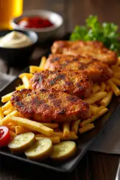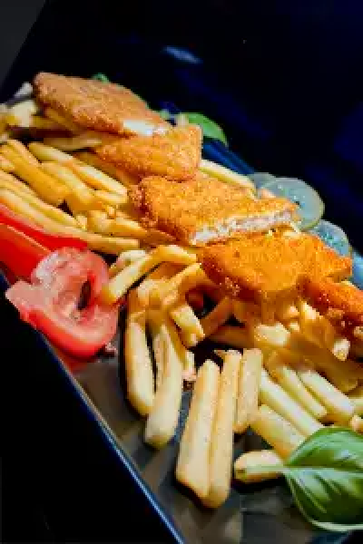 Gegrillte Hähnchenbrust, knusprige Pommes Frites, frische Tomaten und Gurken.
